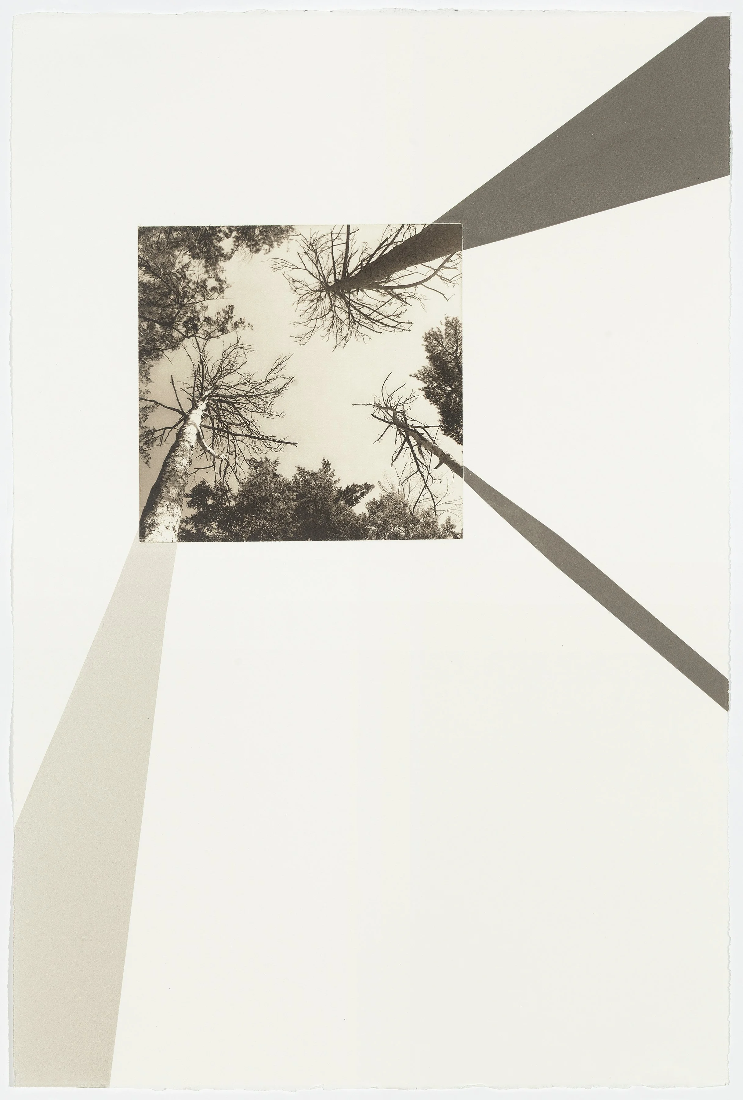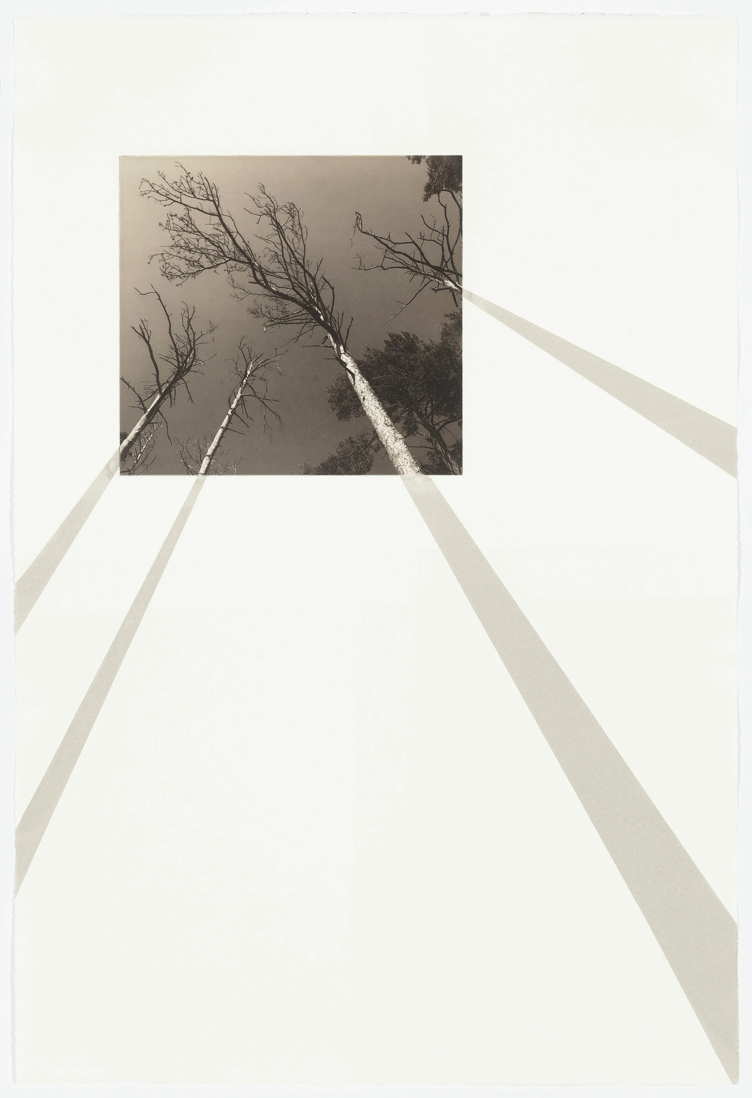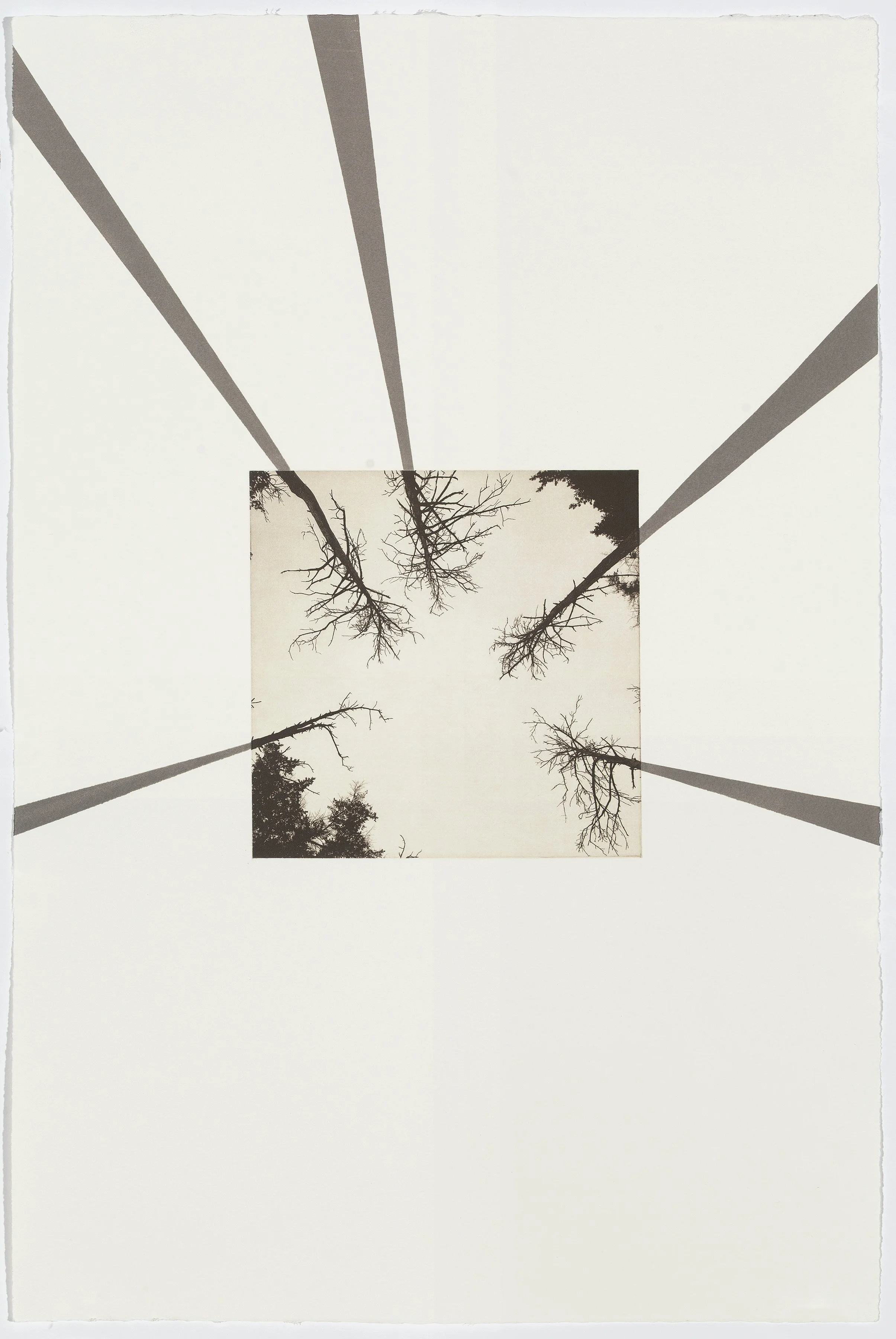 Using photopolymer plates and a process developed by Cone Editions, photogravure intaglio has become a nontoxic continuous tone delight. In this series, photogravure intaglio is combined with screenprinting. The Eagle Lake series studies a grove of red pines at Acadia National Park which have died from an infestation of an invasive insect. The photogravures capture the beauty of the spare canopy against the sky while the screenprint emphasizes the enormously tall straight trunks.