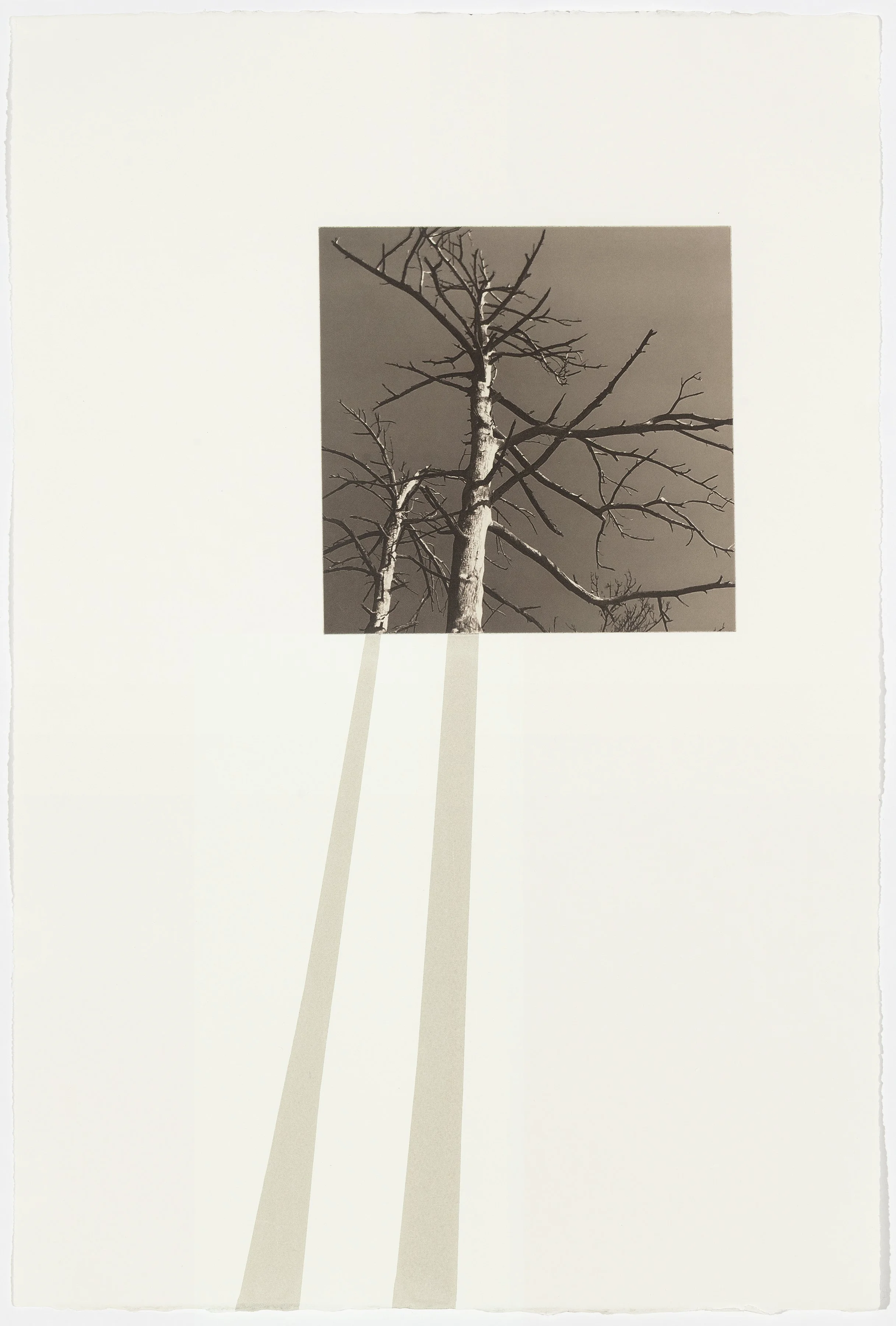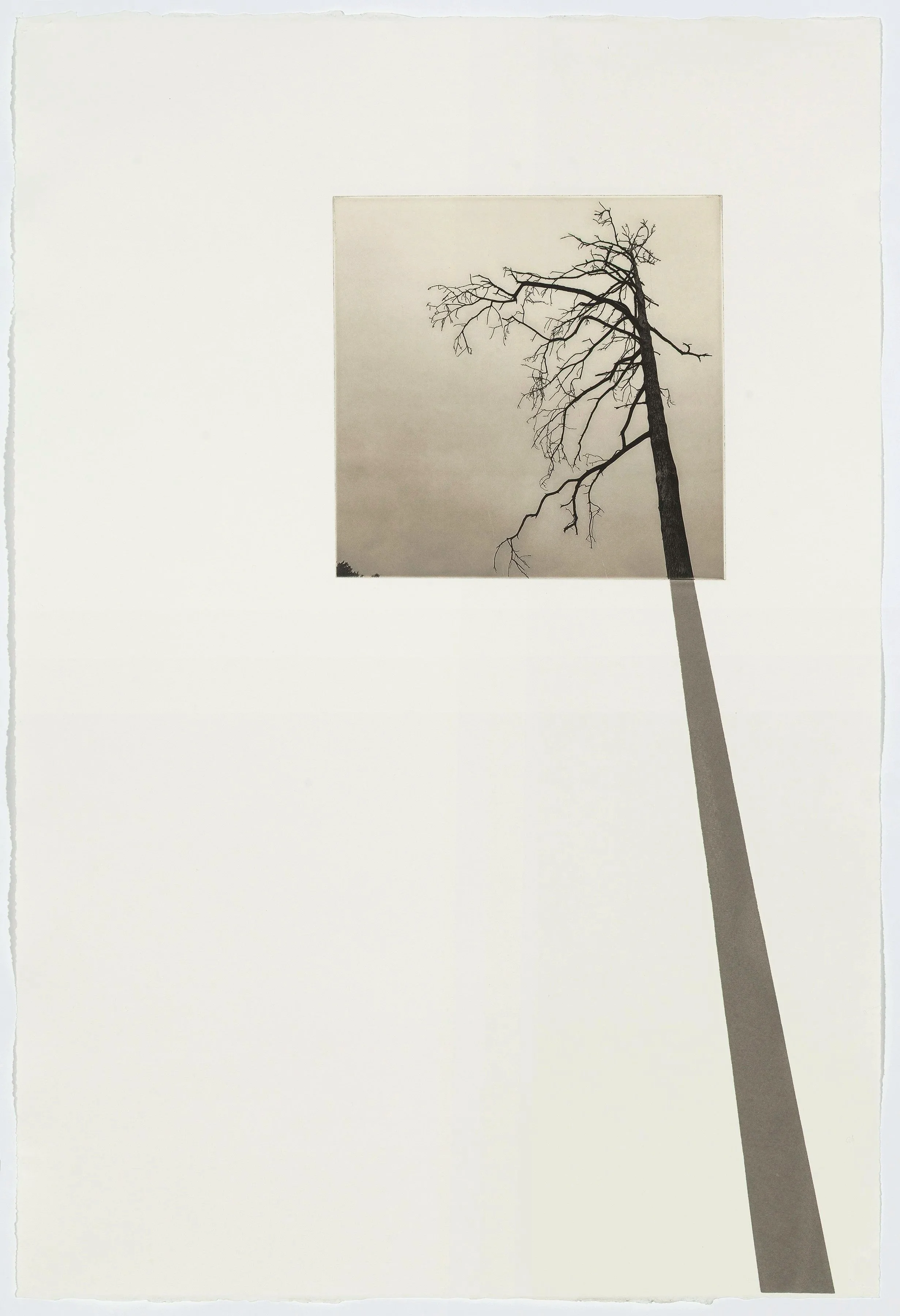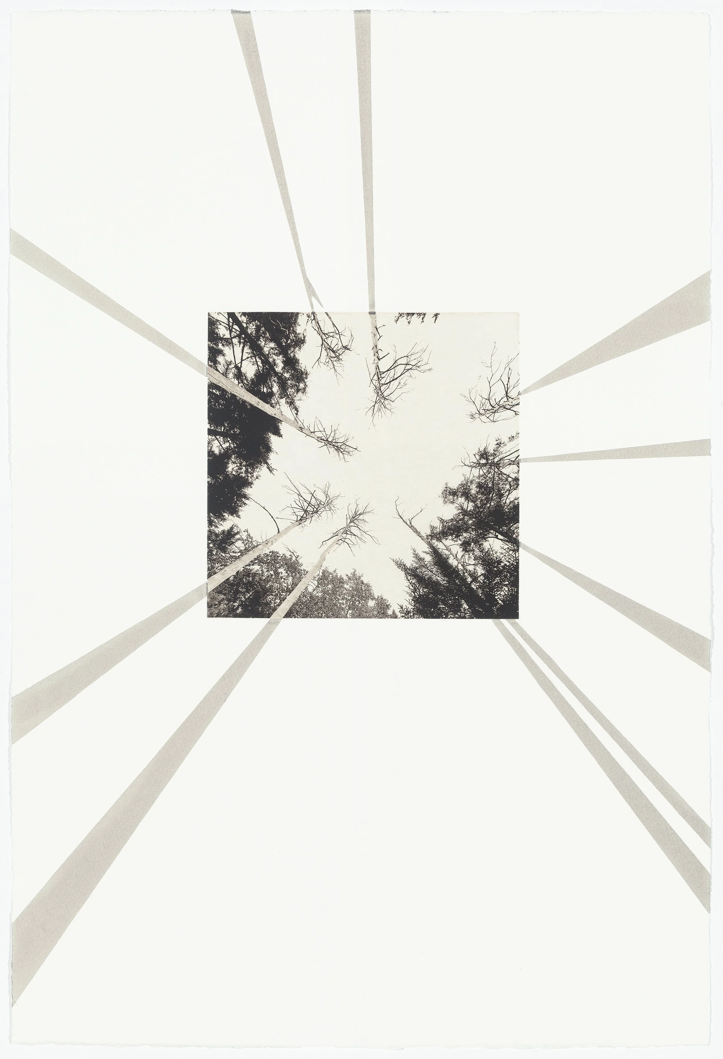 Using photopolymer plates and a process developed by Cone Editions, photogravure intaglio has become a nontoxic continuous tone delight. In this series, photogravure intaglio is combined with screenprinting. The Eagle Lake series studies a grove of red pines at Acadia National Park which have died from an infestation of an invasive insect. The photogravures capture the beauty of the spare canopy against the sky while the screenprint emphasizes the enormously tall straight trunks.