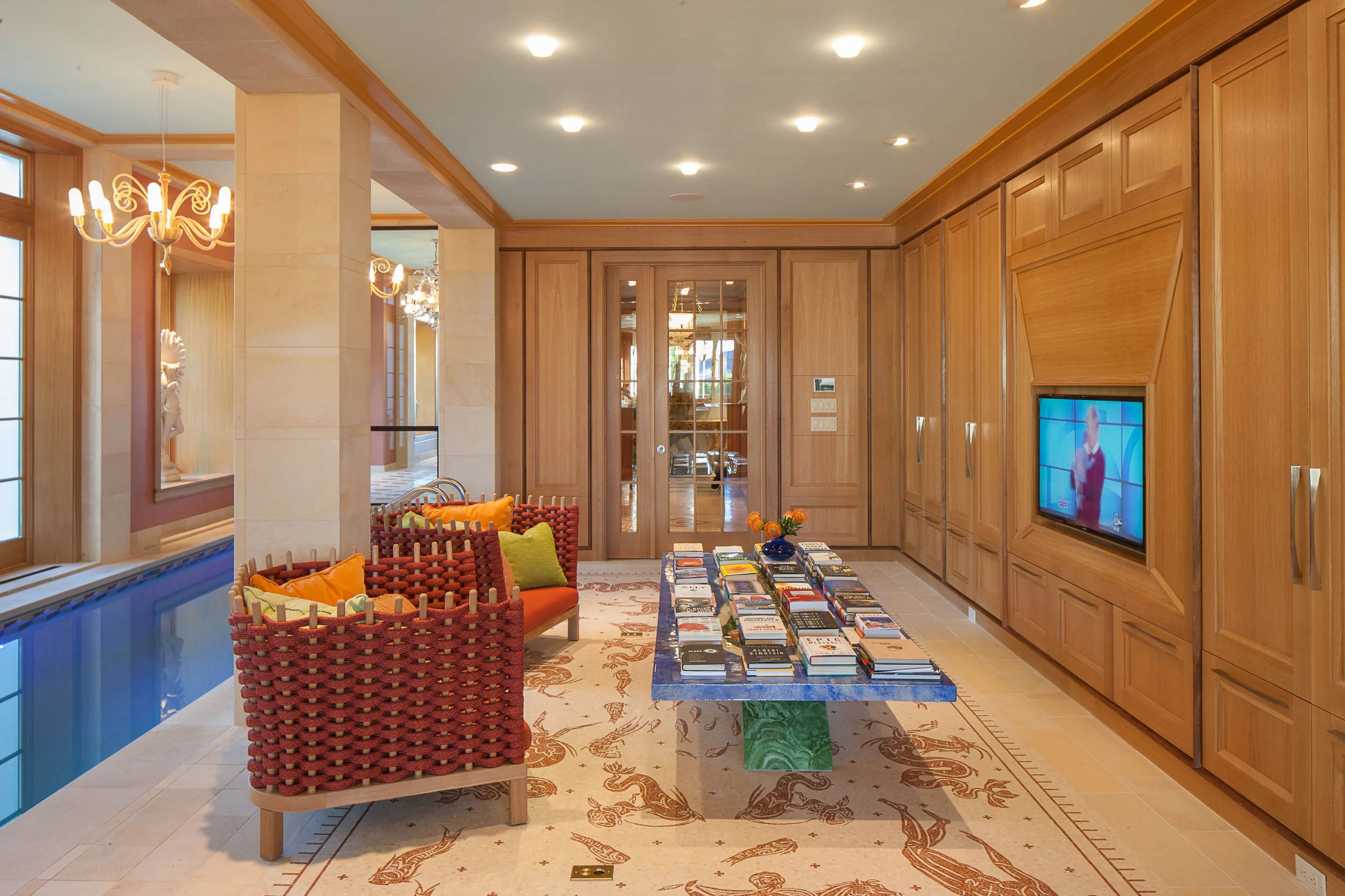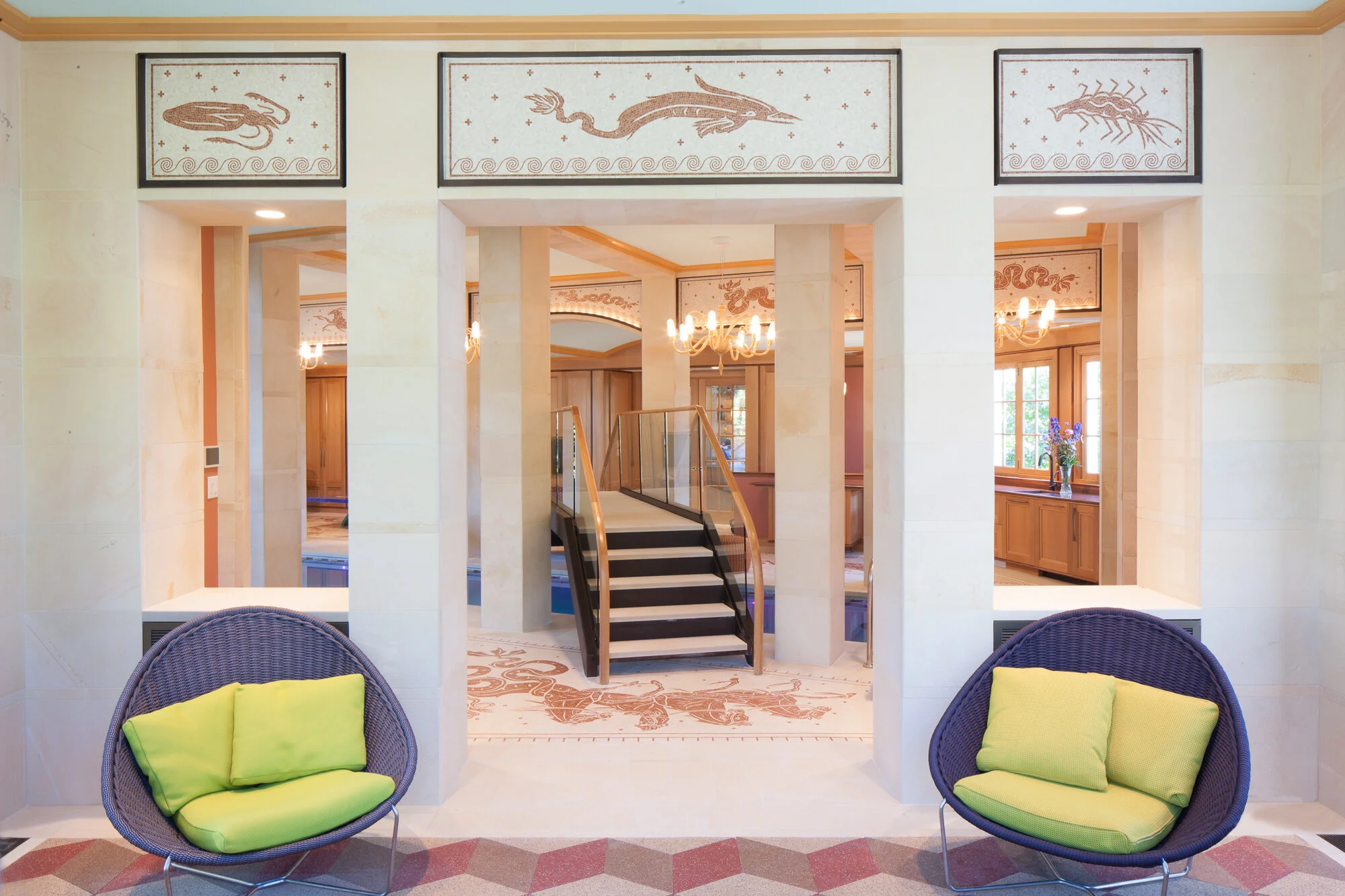 For a client who didn’t want rugs in the pool area, we designed mosaics based on the Baths of Neptune in Ostia Antica.